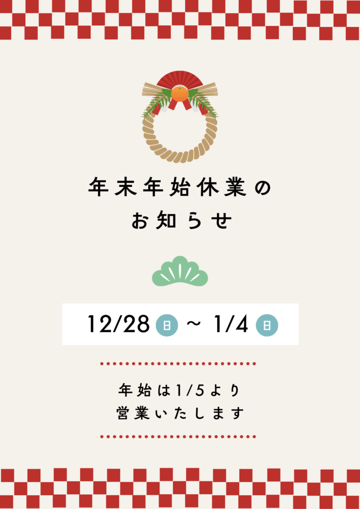 2025年12月01日 年末年始の営業日お知らせ 株式会社ティーアールイーでは12月28日(日)~1月4日(日)の間、冬期休業とさせていただきます。 1月5日(月)より通常営業いたします。 皆様にはご不便をおかけいたしますが、何卒ご了承いただけますようお願いいたします。