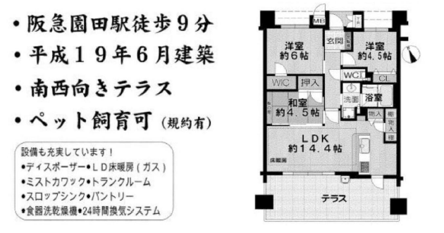 設備・条件 ペット可能 三口コンロ システムキッチン 食器洗い乾燥機 ディスポーザー 浴室乾燥機 温水洗浄便座 トランクルーム エレベータ